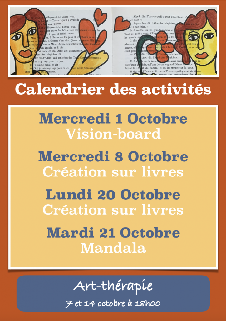 Voici le calendrier des activités artistiques du mois d’octobre.